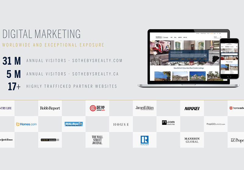 Unparalleled exposure on Sotheby's International Realty's extensive website and global network, including: Sotheby's Realty International, Sotheby's Realty Canada, Financial Times, Market Watch, The Wall Street Journal, Propriétés Le Figaro, Asia Nikkei, PropGoLuxury, Barron’s, House Nikkei Property Listings, Juwai.com, James Edition, Luxury Estate, Mansion Global, Realtor.com, Robb Report, Properstar, Apple TV
